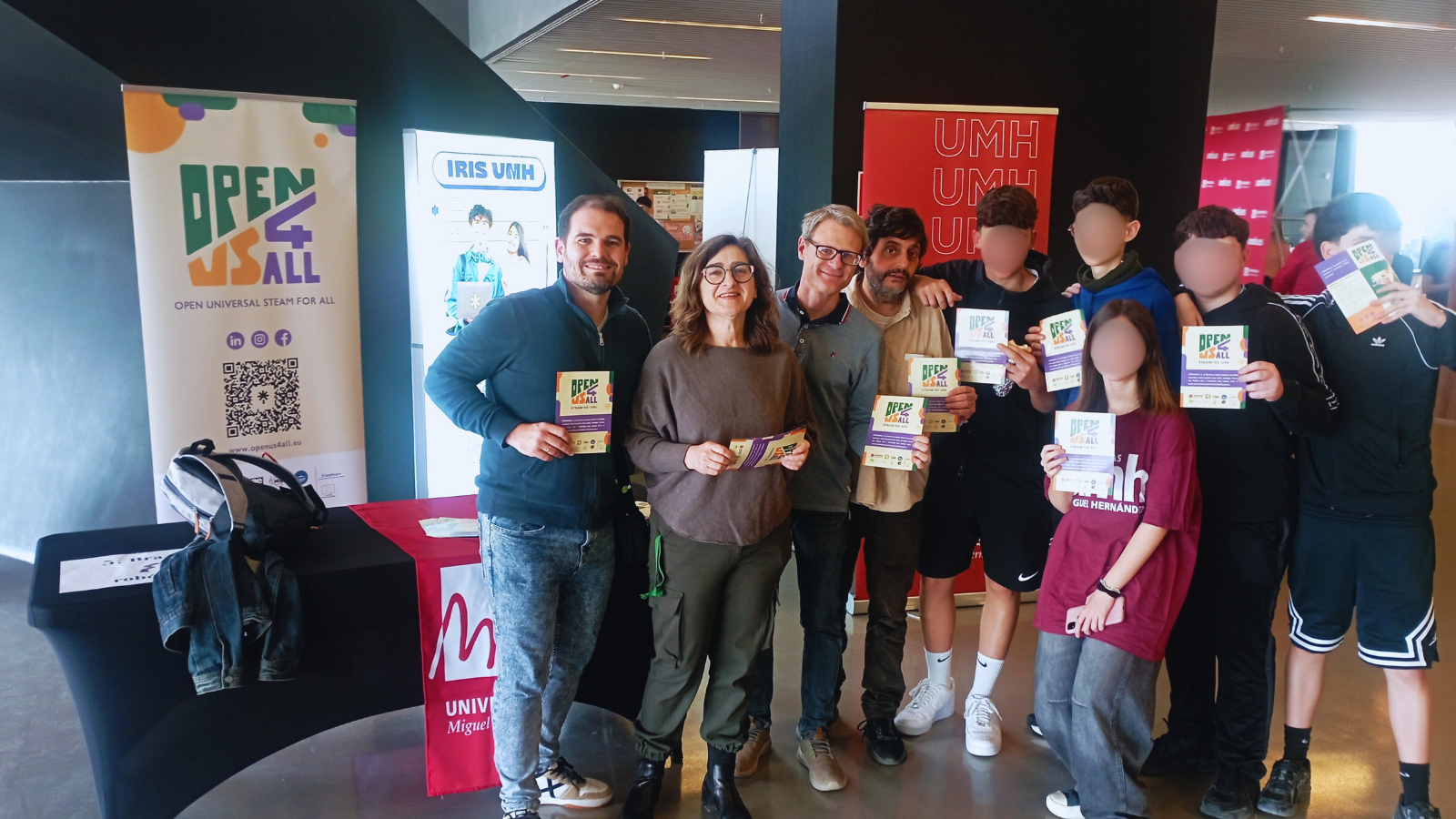 The OpenUs4All team was present at the II Engineering Fair held at the Miguel Hernández University (UMH), taking place on April 10 and 11 of 2025 at the Arenals building on the Elche campus. The event, aimed at high school and secondary students, featured a variety of hands-on workshops covering topics such as Artificial Intelligence, self-supporting bridges and domes, and driving simulators.
